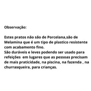 Obsevação: Estes Pratos não são de Porcelana,São de Melamina que é um Tipo de Plastico Resistente com acabamento Fino.São duráveis e leves podendo ser usado para refeições e em lugares que as pessoas precisam de mais praticidade, na piscina, na fazenda , na churrasqueira, para crianças.