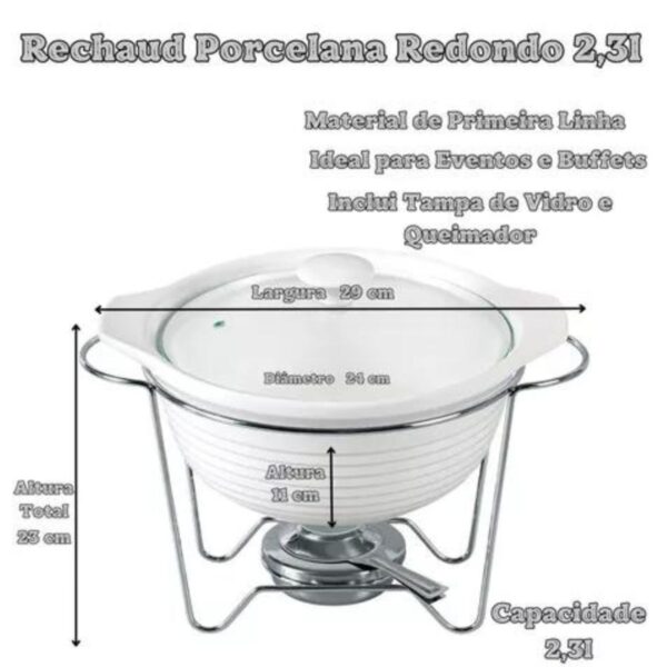 Este conjunto completo é perfeito para quem deseja servir sopas e caldos quentes de forma prática e elegante. Feito de porcelana resistente e durável, com tampa de vidro, suporte para a travessa e queimador em aço inox, este réchaud é um item essencial em qualquer evento ou jantar.