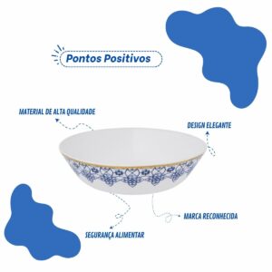 Imagine uma tarde tranquila em uma casa elegante, onde um almoço refinado está sendo preparado com cuidado e atenção aos detalhes. Na mesa, a Saladeira Lusitana da Porcelana Oxford se posiciona como uma peça central, com sua porcelana branca pura e detalhes em azul que adicionam um toque de sofisticação ao ambiente.