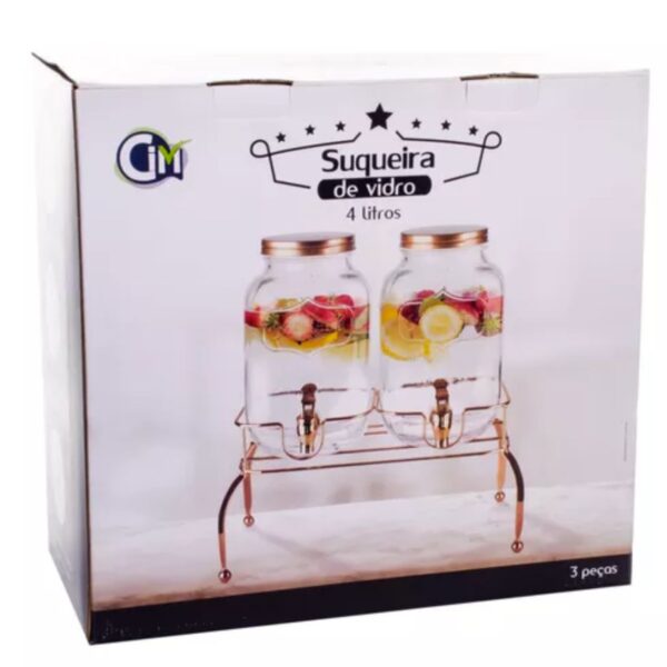 Produzida em corpo de vidro com torneira de plástico e suporte de metal, as suqueiras possuem capacidade de 4 litros que favorece o armazenamento e reabastecimento rápido, possibilita a utilização de frutas e ervas para deixar mais atraente sua bebida.