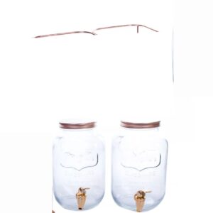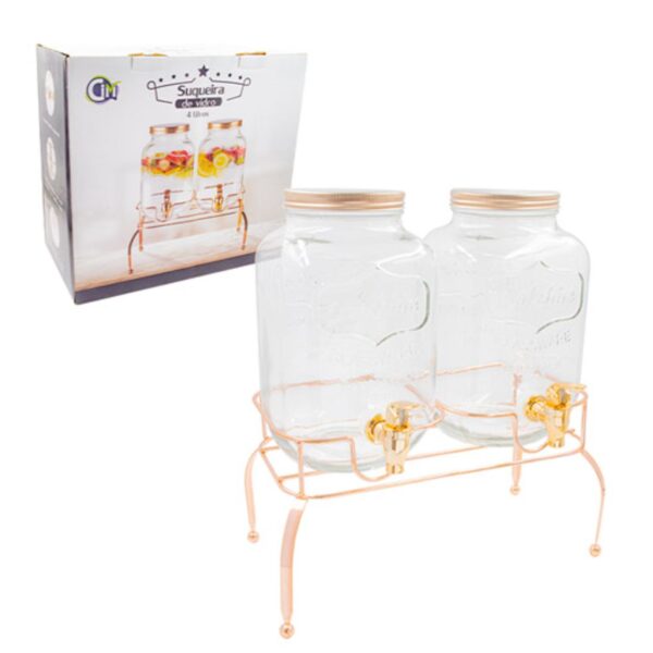 Linda suqueira dupla fabricada em vidro de ótima qualidade e alta resistência. Com capacidade para 4 litros cada, acompanham tampas de rosquear, torneiras e suporte para o armazenamento prático e seguro das peças.