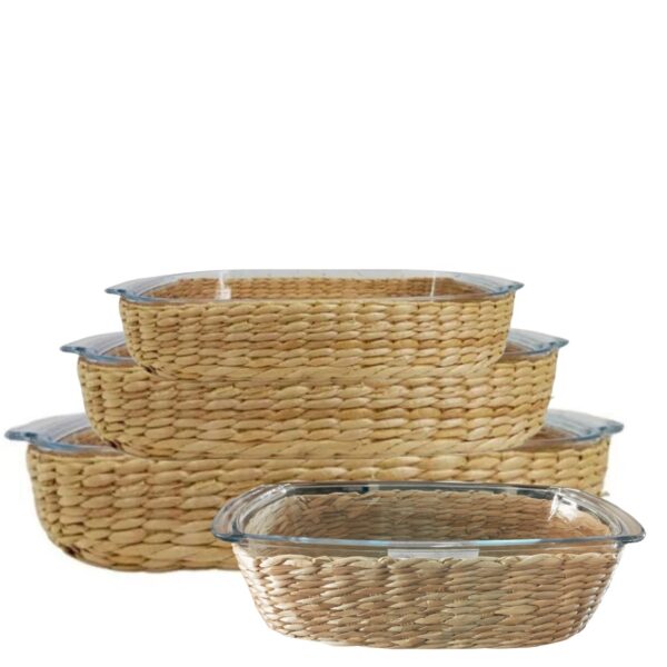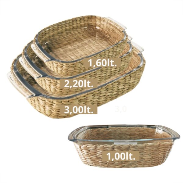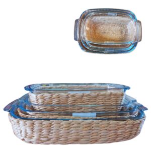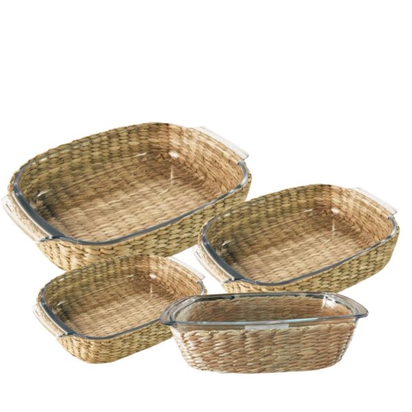 Travessa e Assadeira Refratárias 4un Vidro com Suporte de Rattan