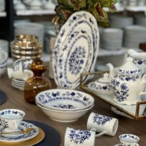 A linha Cebolinha, com seu delicado padrão de cebolinhas em azul sobre um fundo branco, confere um toque de frescor e charme a qualquer mesa. Esse design atemporal e versátil combina com diversos estilos de decoração e ocasiões, desde jantares informais até eventos mais sofisticados.