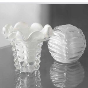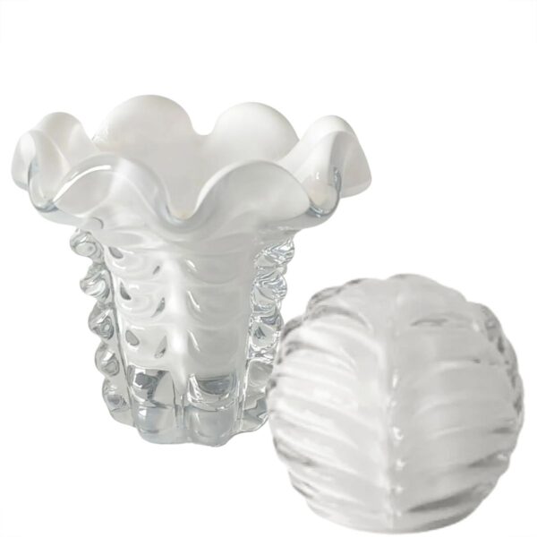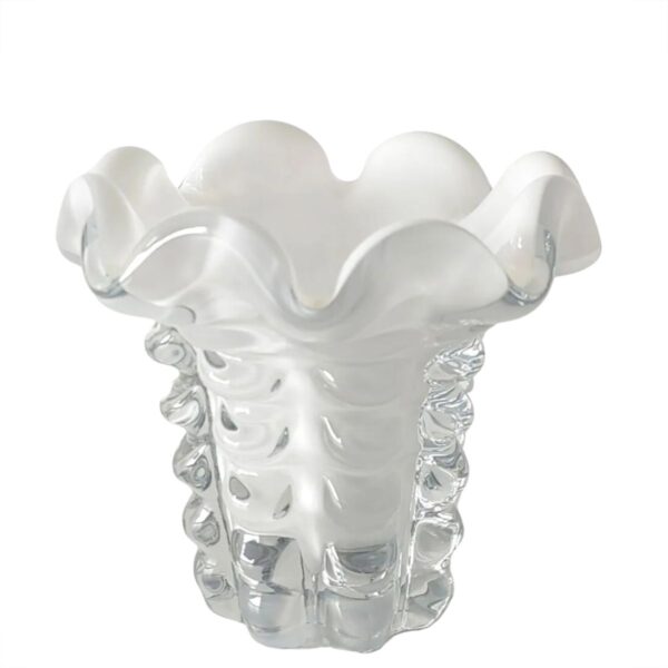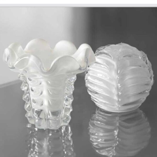 Fabricados em vidro de alta qualidade, esses vasos são verdadeiras obras de arte, combinando a transparência externa com o delicado interior branco, criando um efeito visual único que ilumina qualquer ambiente.