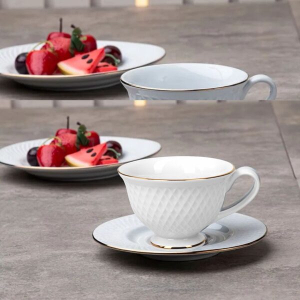 • 6 Xícaras e 6 Pires com 220ml cada,