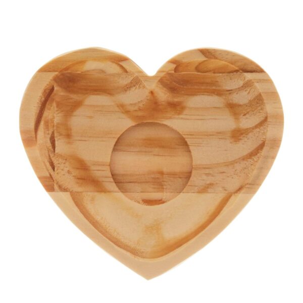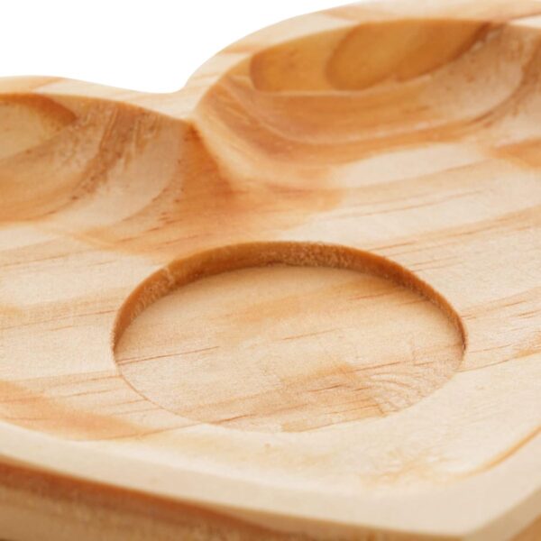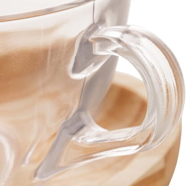 Os pires em formato de coração são a peça-chave do conjunto, trazendo um charme especial e um toque de romantismo. Fabricados em madeira com acabamento natural, são leves e oferecem uma base estável para a xícara, adicionando um contraste sutil e elegante ao vidro.