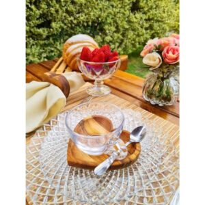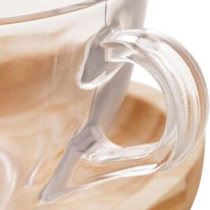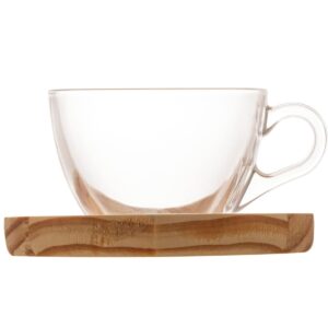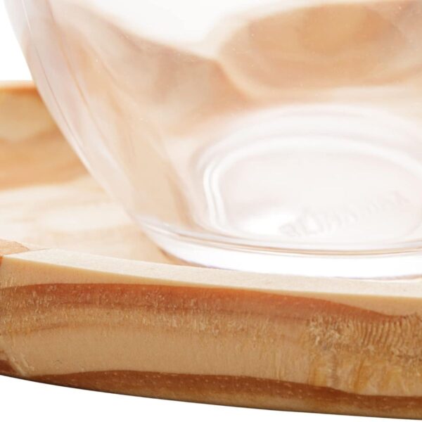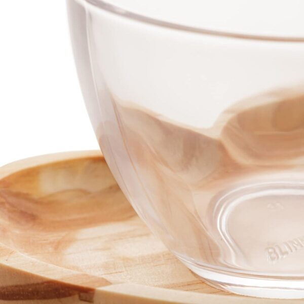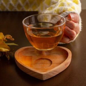 Este elegante conjunto é composto por 6 xícaras de chá de vidro transparente, cada uma com capacidade de 190 ml, e 6 pires em formato de coração, feitos em madeira com acabamento natural.