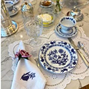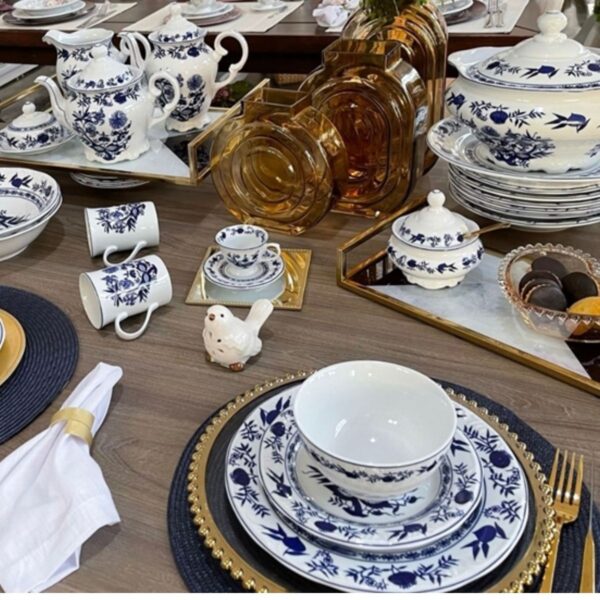 A linha Cebolinha, com seu delicado padrão de cebolinhas em azul sobre um fundo branco, confere um toque de frescor e charme a qualquer mesa. Esse design atemporal e versátil combina com diversos estilos de decoração e ocasiões, desde jantares informais até eventos mais sofisticados.