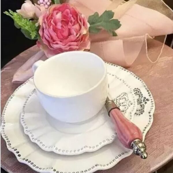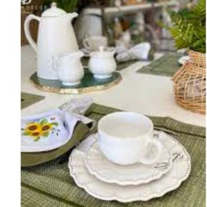 06un Xícaras para Chá com 260ml cada e 06un Pires, 06un de Pratos Sobremesa com 21cm de diametro cada.