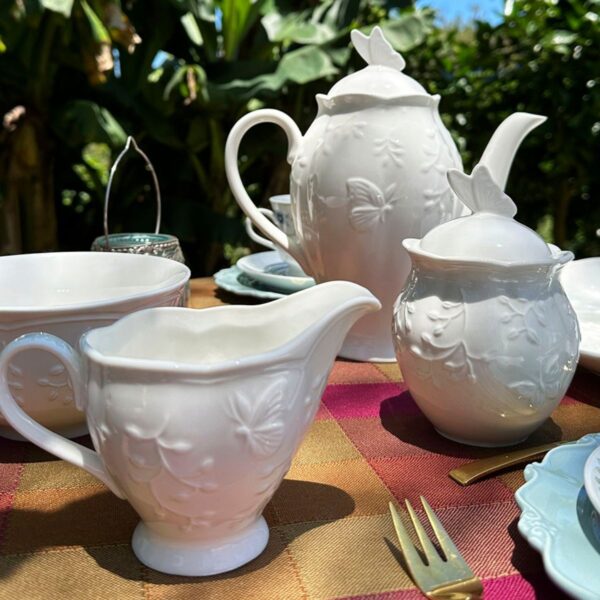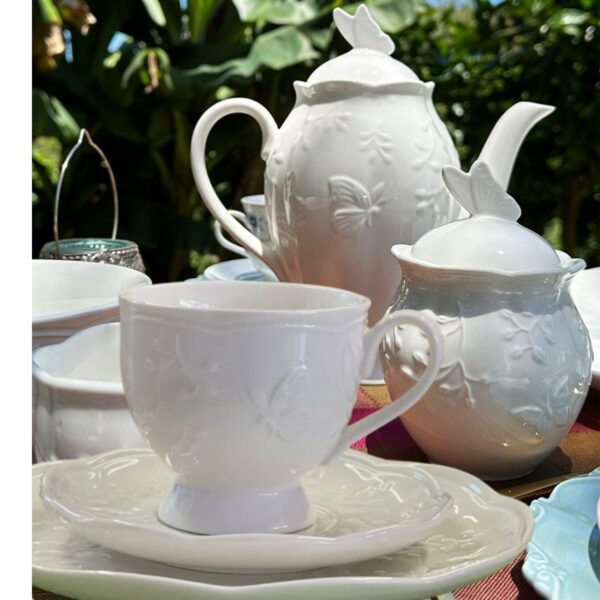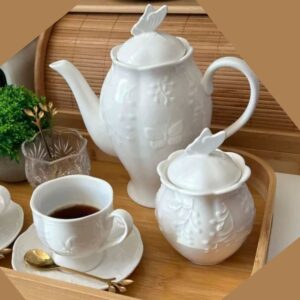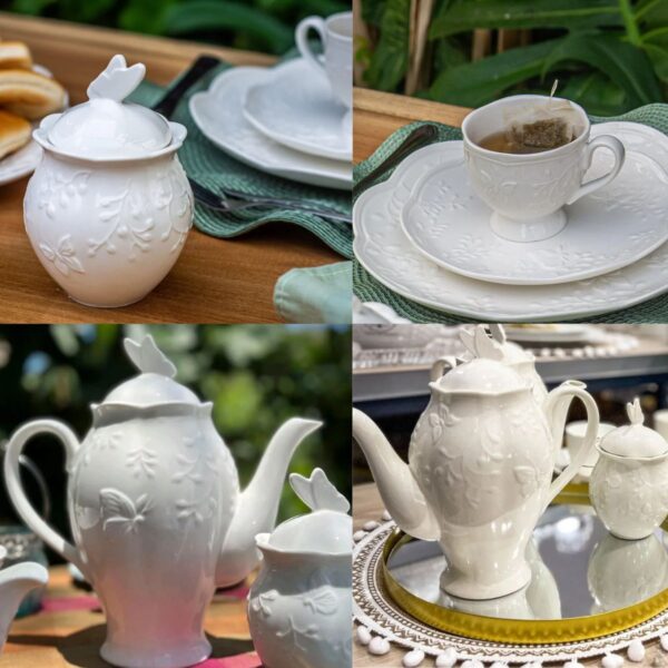 Como Usar: Ofereça uma bebida quente como chá ou café, servidos diretamente do bule. Prepare a mesa com todos os itens bem organizados, destacando o design floral e os detalhes em borboletas para criar uma experiência visualmente agradável.